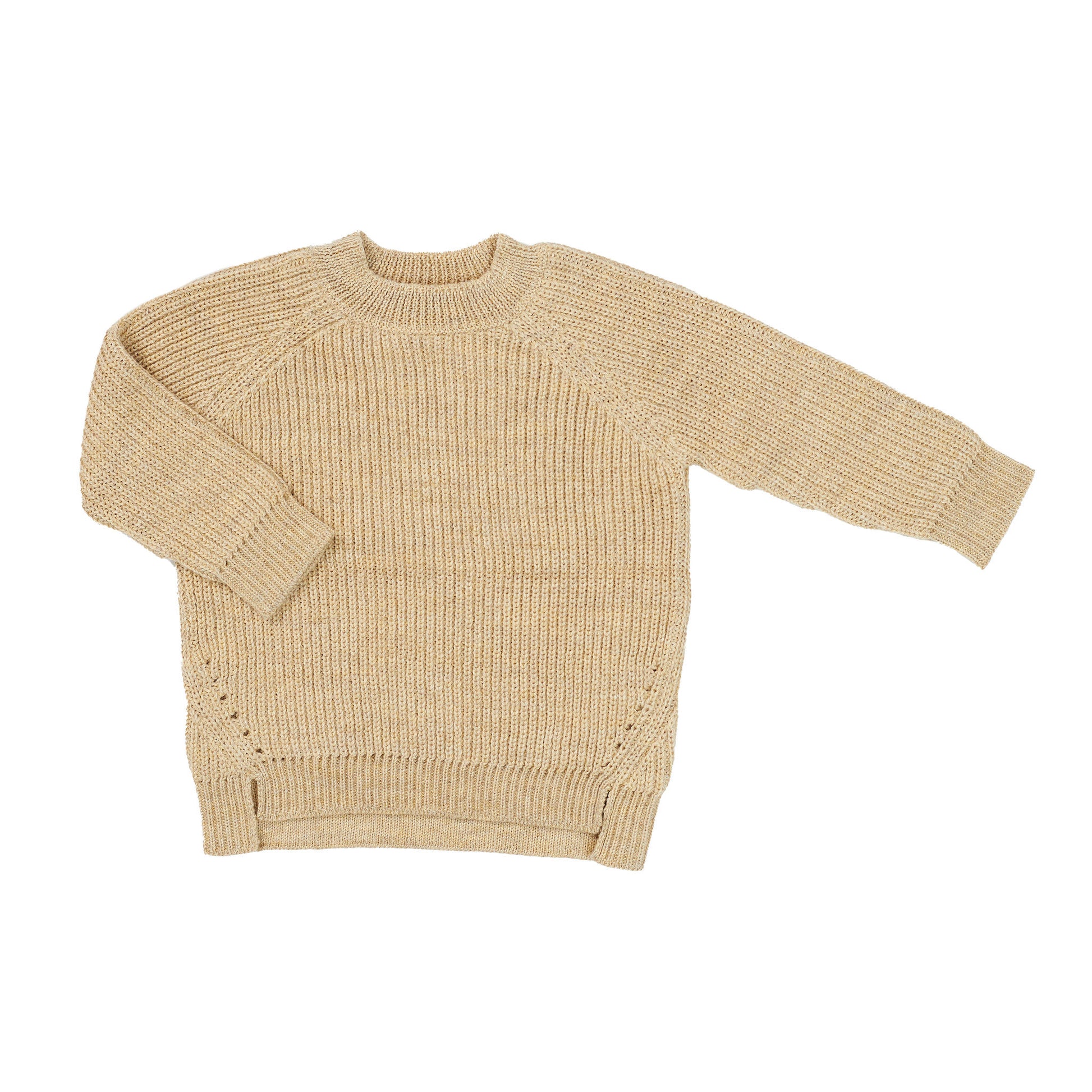 This sweater in a classic fisherman’s rib stitch features a longer back hem and pointelle stitch detail.