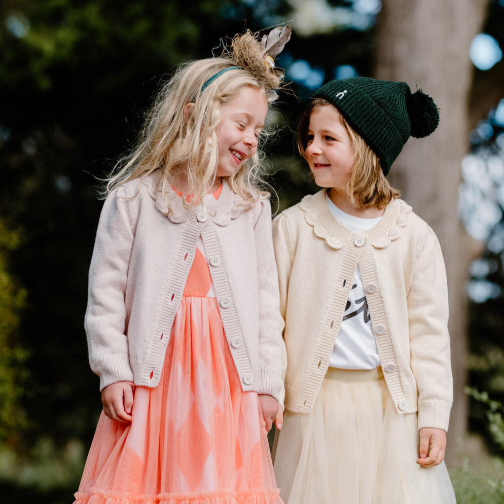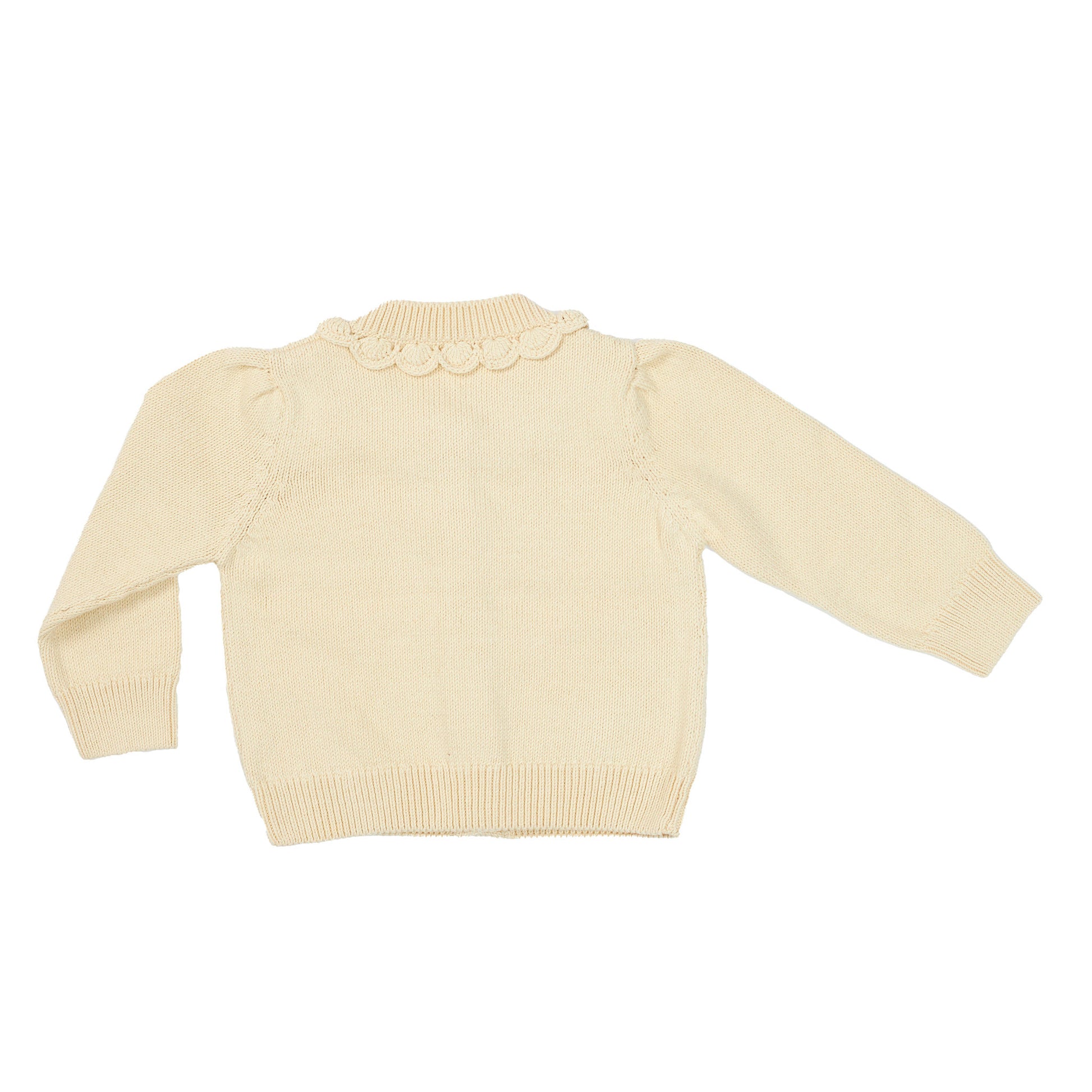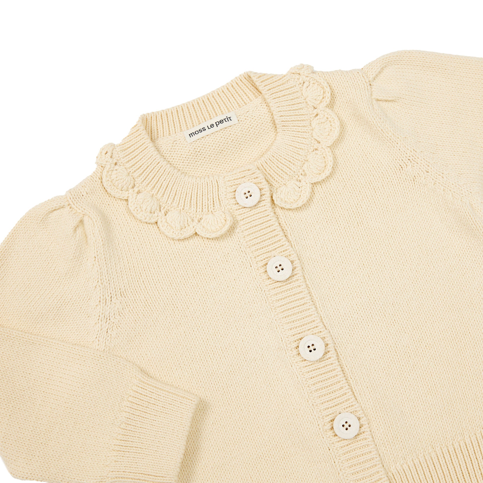 With a delightful hand crocheted trim at the neckline, and knit in the softest cotton, this cardigan is a timeless essential. Finished with responsibly sourced recycled cotton buttons.